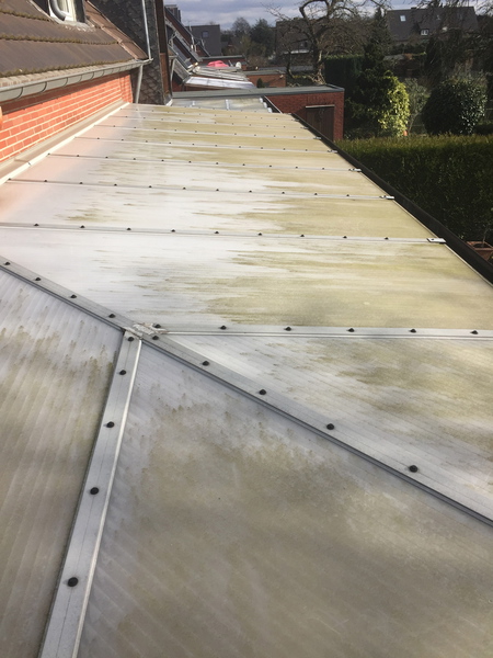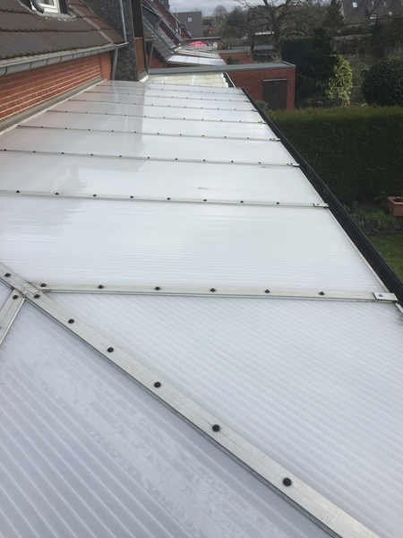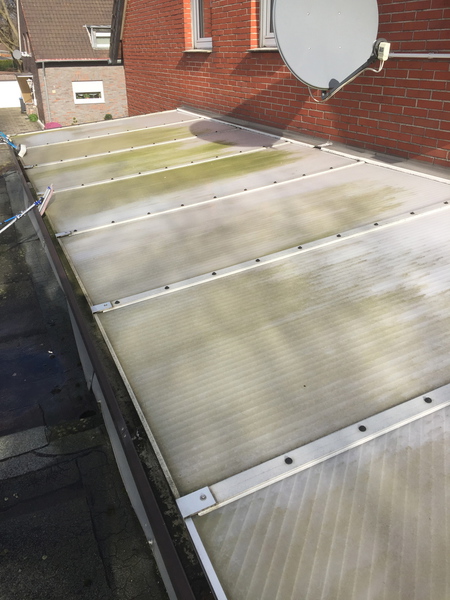 Reinigung einer Terrassenüberdachung aus Polycarbonat- Stegplatten.