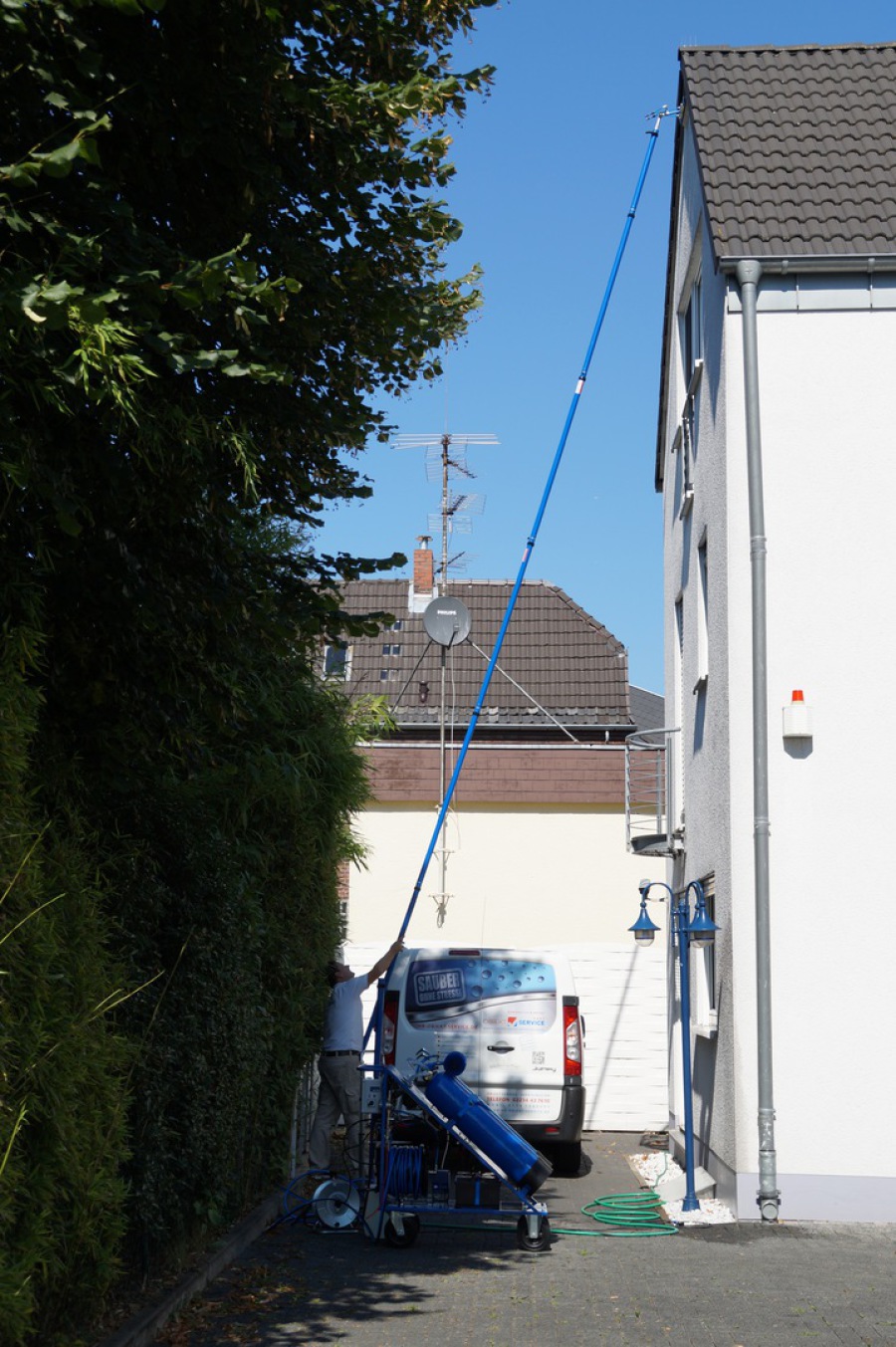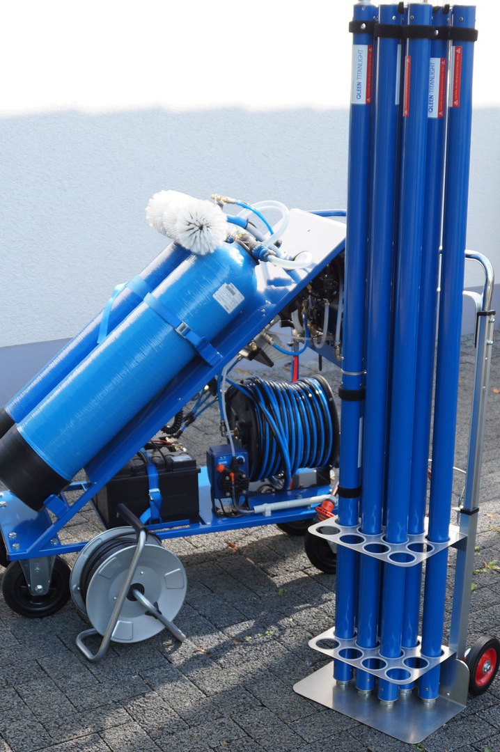 - Steiger und Leiter wird so gut wie nicht mehr benötigt, da vom Boden aus bis zu z. Zt. ca. 12 m (max. 20m) mit einem Speziellen Stangensystem bedient werden können.